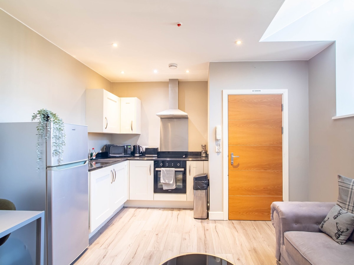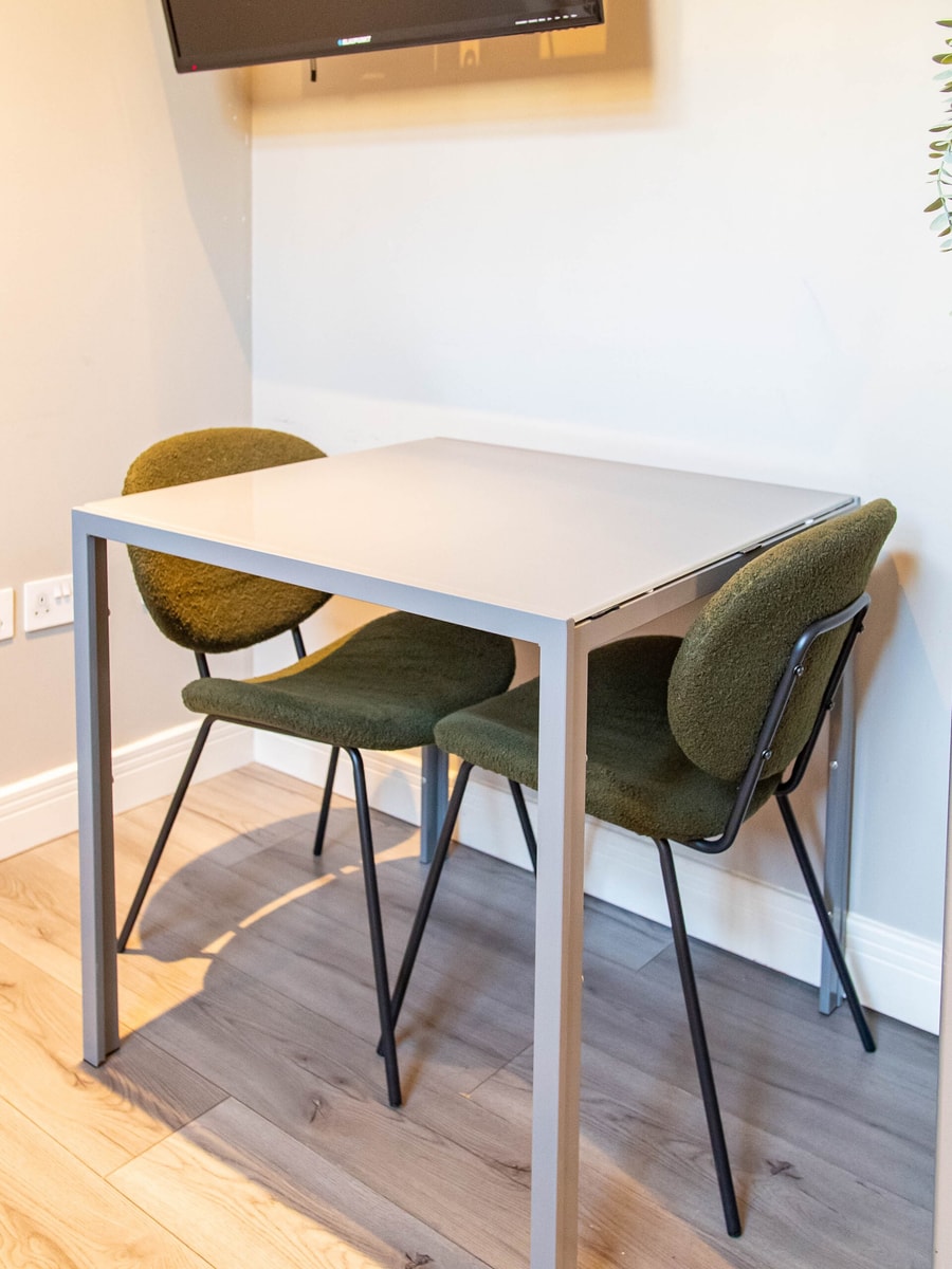 The open-plan living area is both relaxing and functional, featuring a comfy sofa, a Smart TV with Netflix, and a cosy dining table perfect for meals or laptop work. The fully equipped kitchen includes an oven, hob, microwave, fridge, kettle, toaster, and all the essentials for cooking at home — whether it’s a full meal or just breakfast before heading out.